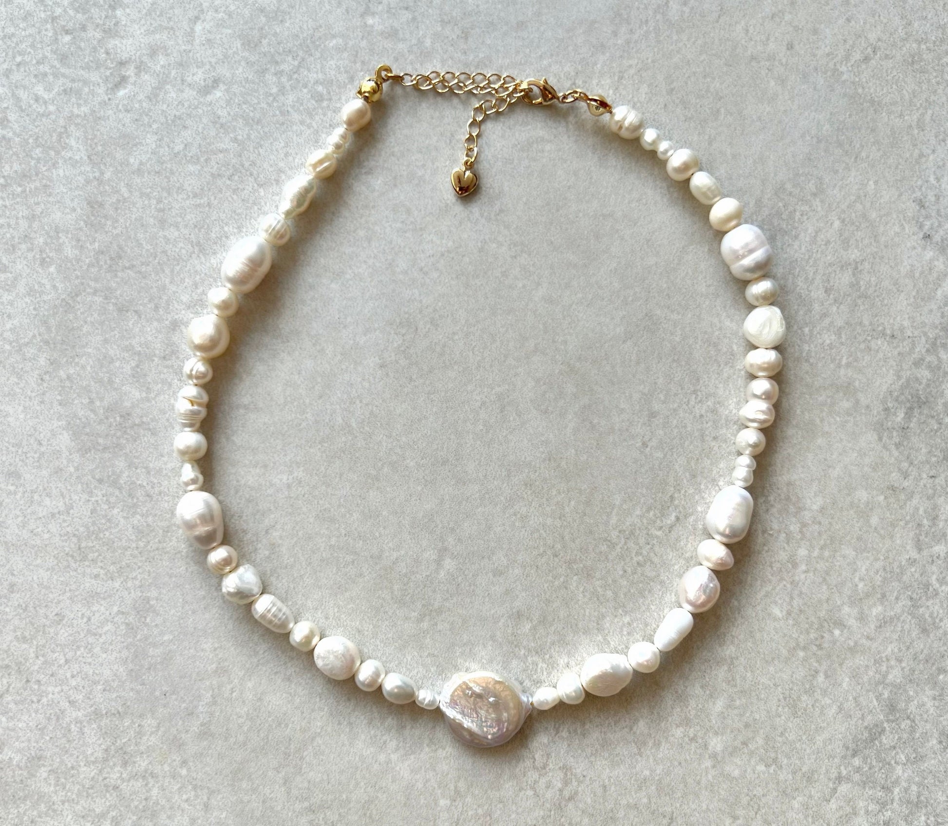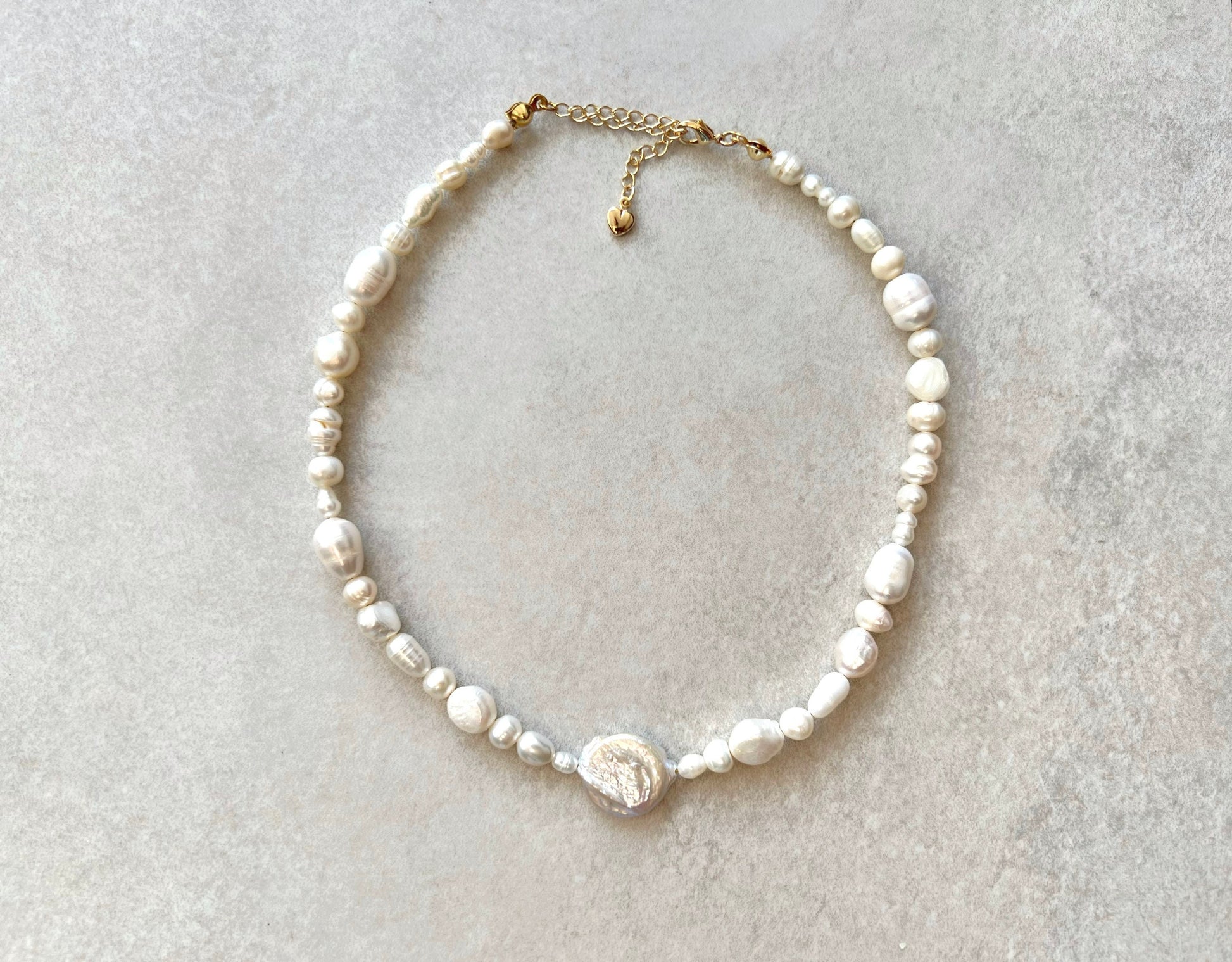 Pearls go with everything—and this Different Size Pearl Necklace proves it. Handcrafted with genuine freshwater baroque coin pearls and adorned with irregular pearls in varying sizes, this eye-catching necklace combines elegance with individuality. Finished with your choice of sterling silver or gold-filled detailing, it’s the perfect statement piece for both everyday wear and special occasions.