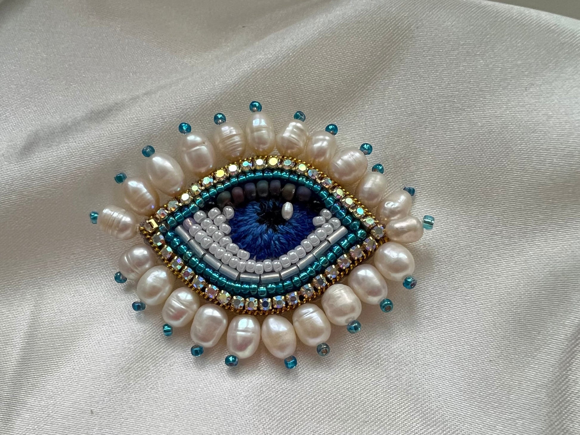 Handmade Evil Eye Brooch with Pearls – Protective Amulet & Stylish Accessory