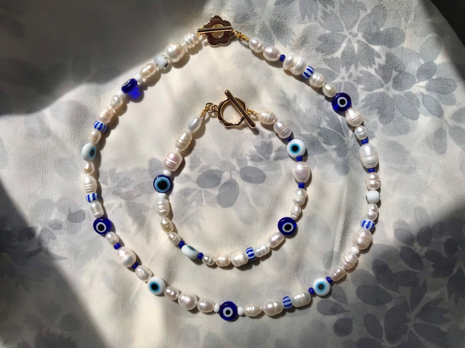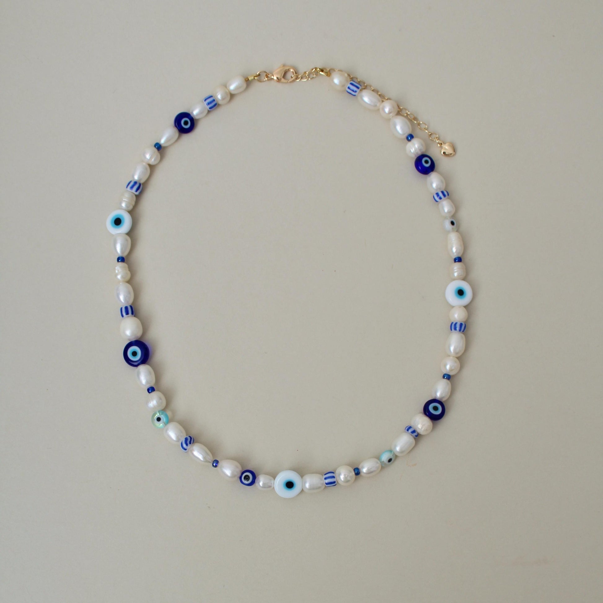 Evil Eye Pearl Necklace – Genuine Pearls with Glass Beads