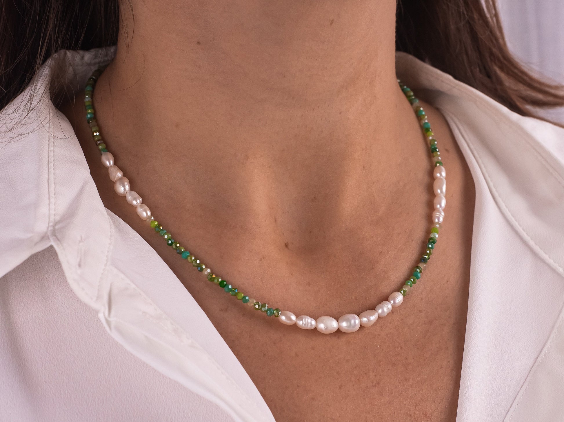 Bright and elegant, this necklace is handcrafted with natural river pearls and Czech crystals in shades of green. Lightweight and refined, it’s the perfect finishing touch for your everyday outfits and makes a thoughtful gift for a friend, mother, sister, or yourself.