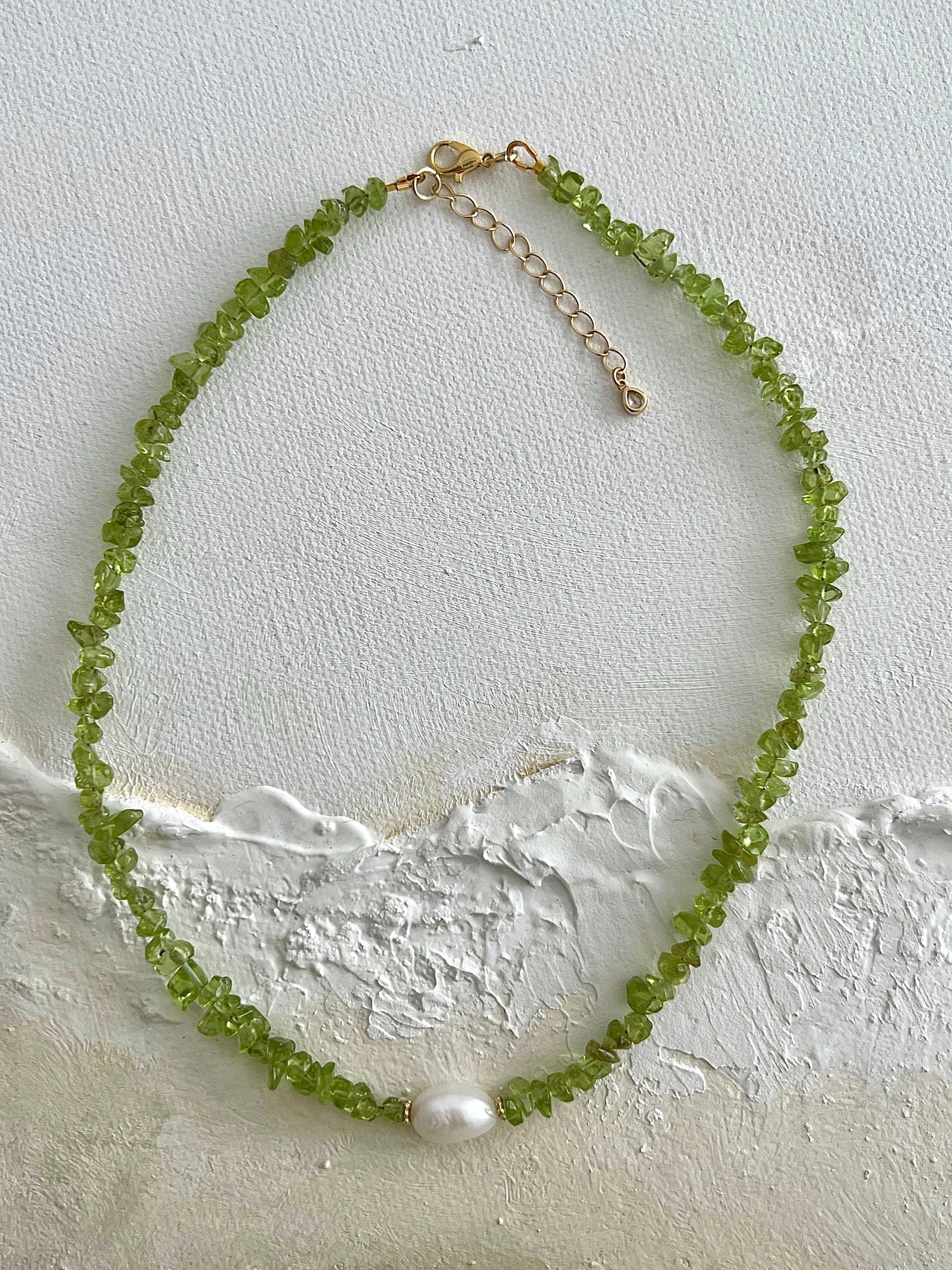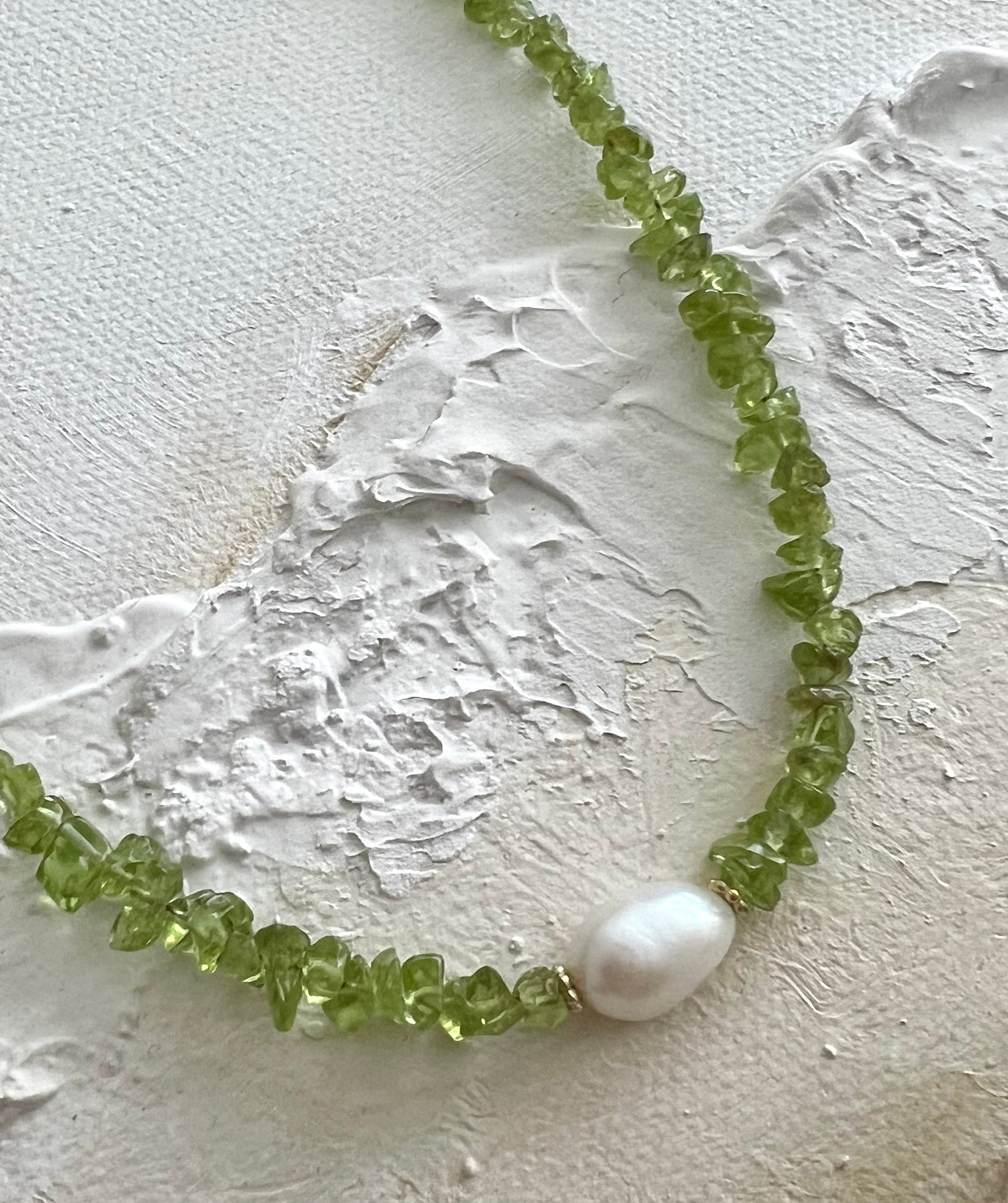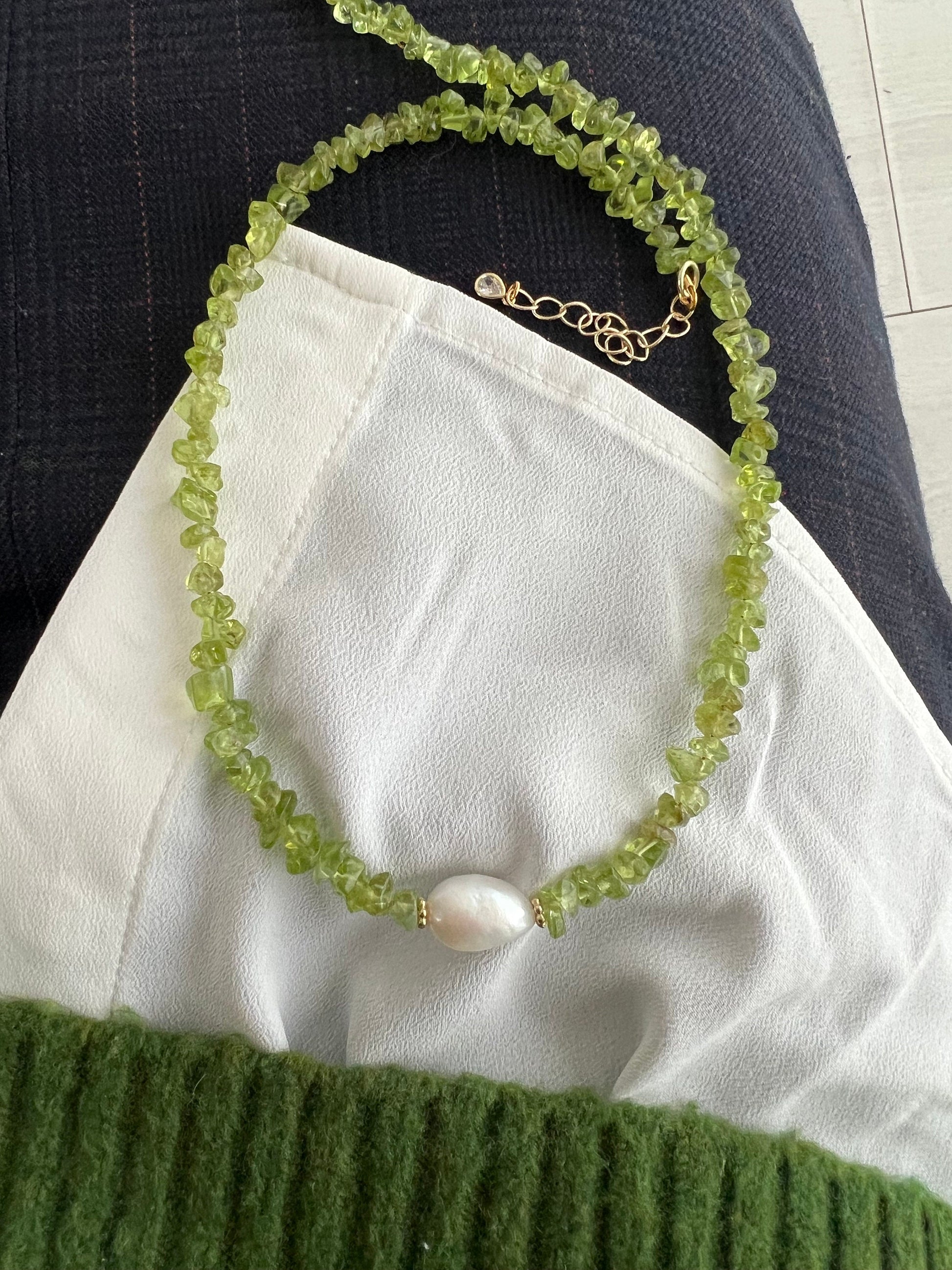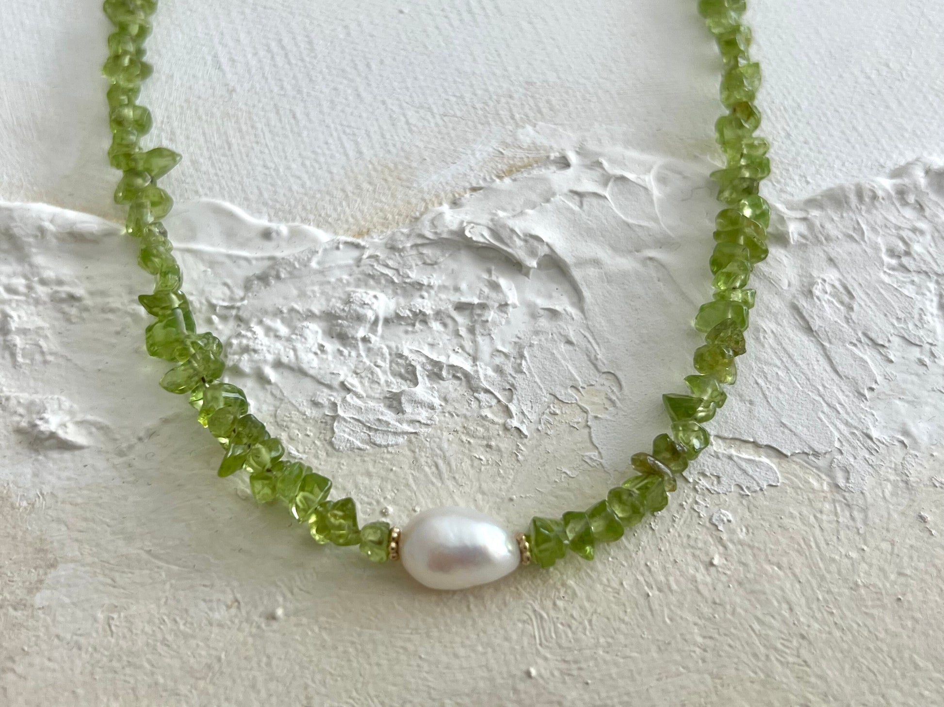 Made with peridot gemstones (4–5 mm) and a freshwater pearl (approx. 10 mm)