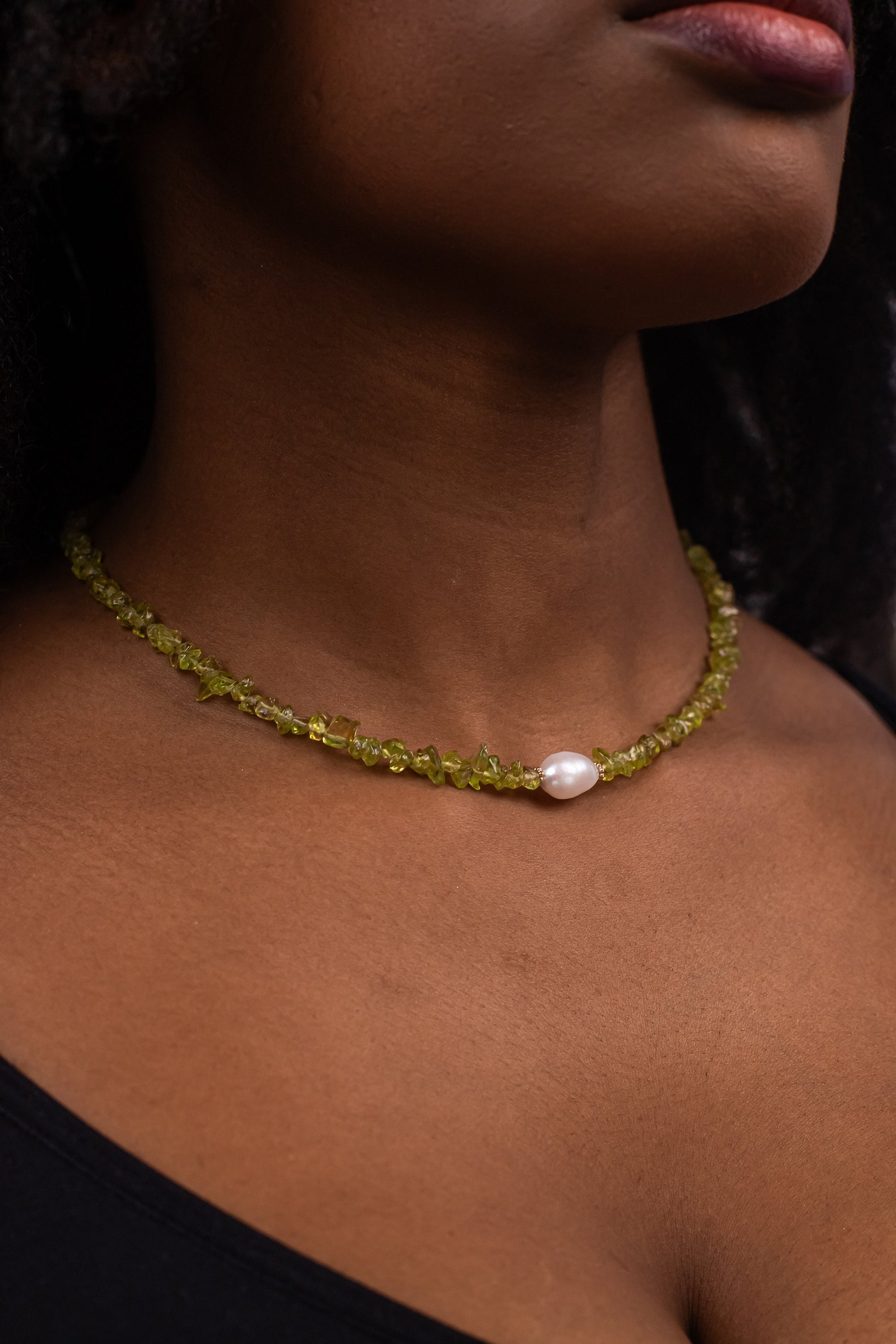Inspired by the beauty of mountain landscapes, this necklace is handcrafted with jagged peridot gemstones and a lustrous freshwater pearl accent. The bright green peridot stones (4–5 mm) bring natural vibrancy, while the pearl (approx. 10 mm) adds timeless elegance. Finished with an 18K long-lasting gold coating, this necklace combines earthy charm with refined style.