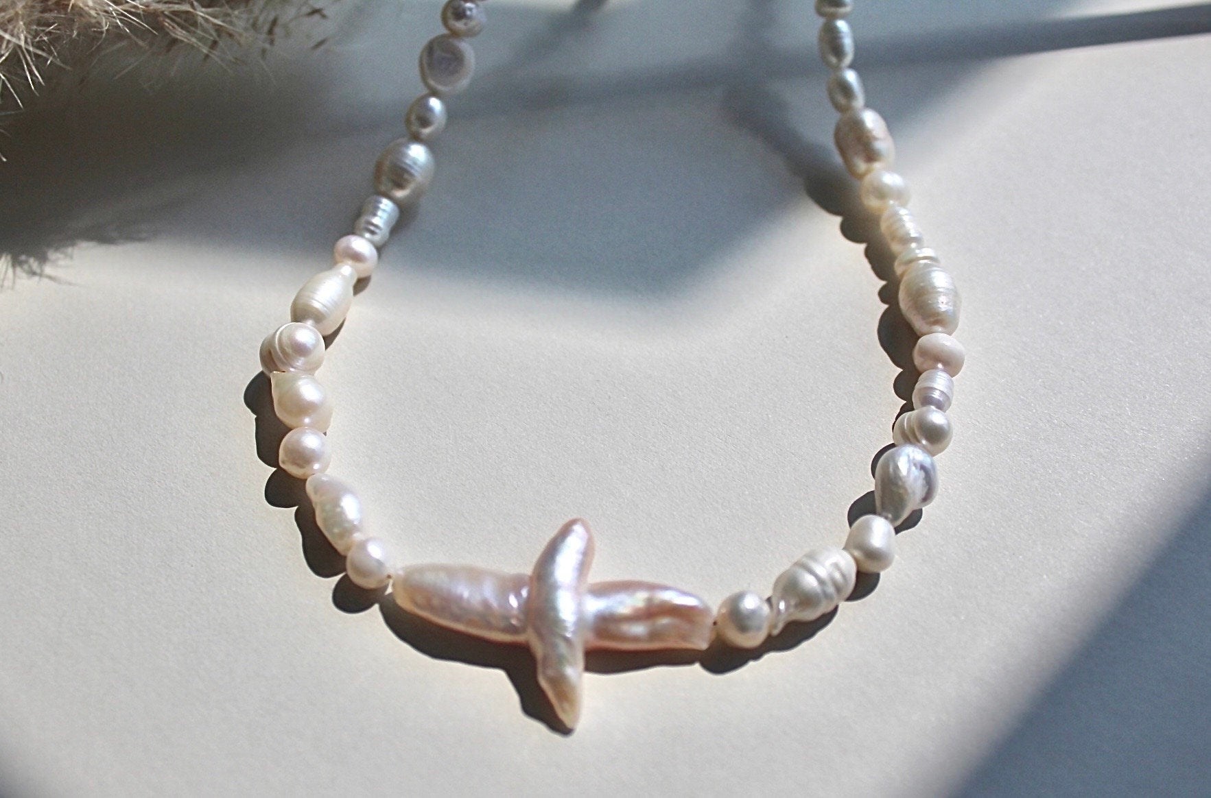 This Different Size Pearl Necklace is a striking statement piece designed to make you stand out. Handcrafted with genuine freshwater pearls in unique shapes ranging from 4–10 mm, it features a distinctive baroque cross-shaped pearl as the centrepiece. Finished with elegant gold plating, this necklace balances bold individuality with timeless elegance, making it perfect for both everyday wear and special occasions.