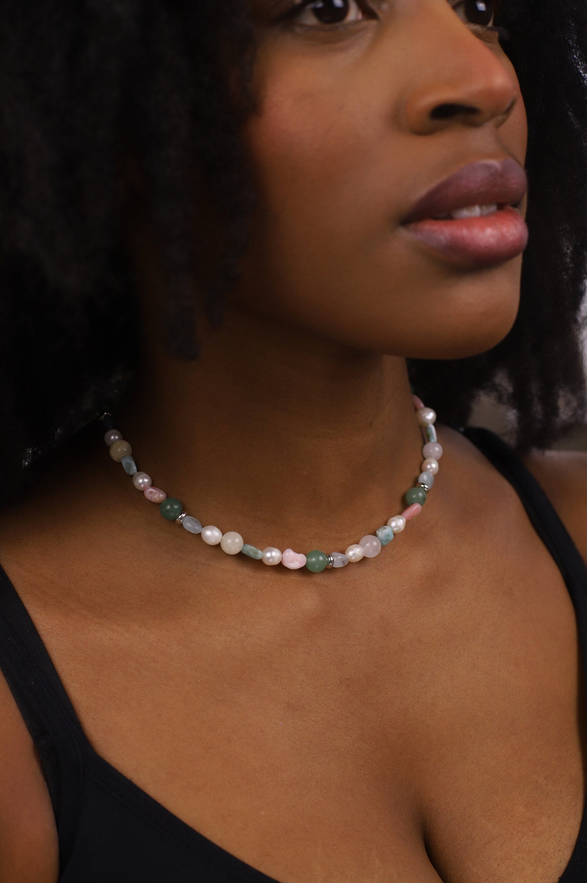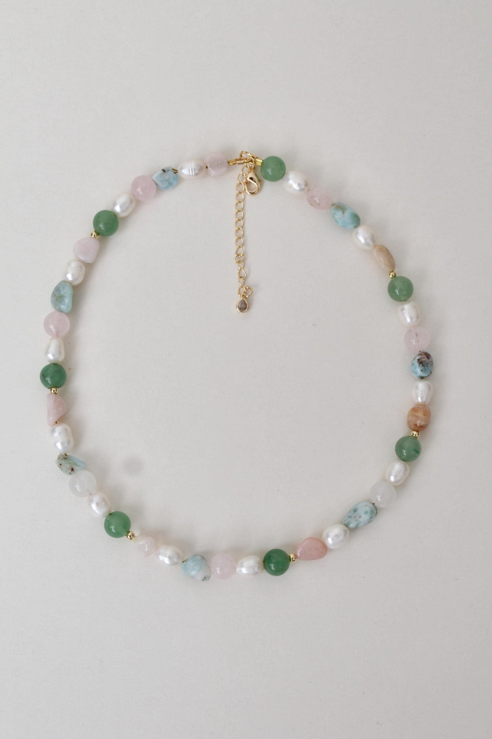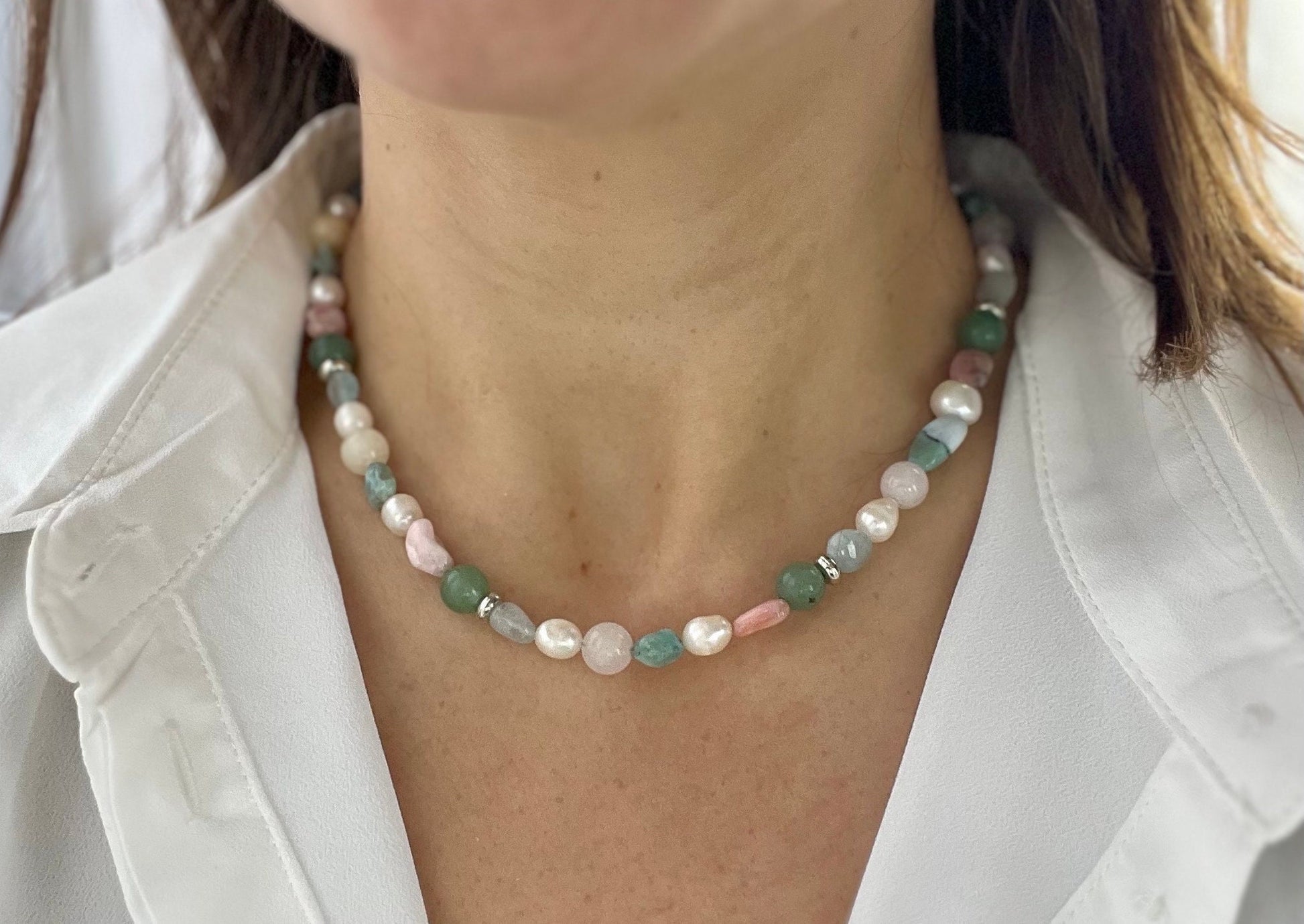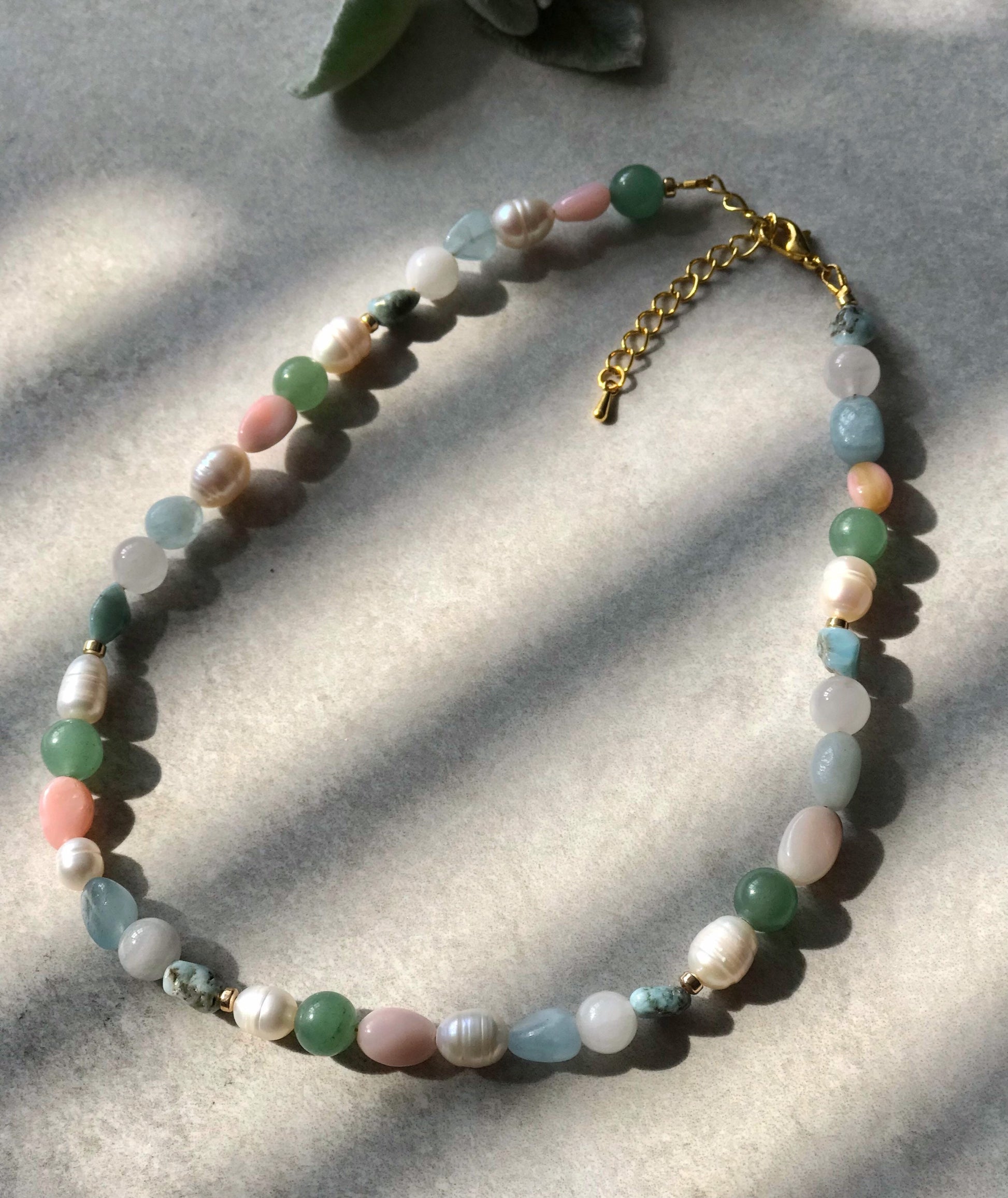 This romantic gemstone and pearl necklace is the perfect accessory for both special occasions and everyday wear. Handcrafted with genuine freshwater pearls, rose quartz, aquamarine, aventurine, laminar, and pink opal stones, it combines natural beauty with a touch of bohemian elegance. Finished with an 18K gold coating, it’s a versatile and eye-catching addition to any jewellery collection.
