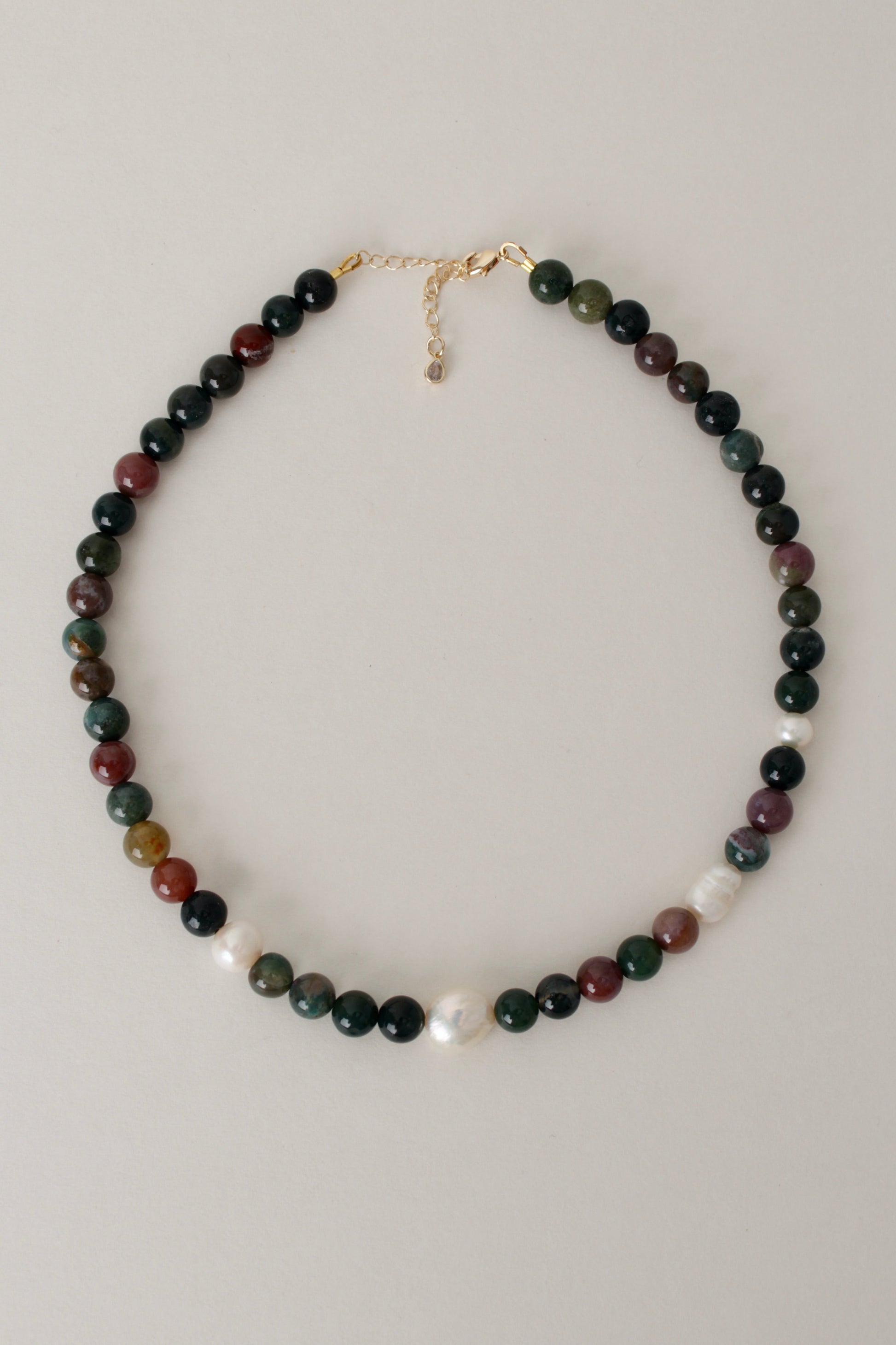 Bring balance, elegance, and timeless beauty into your everyday style with this handmade Indian Agate and Freshwater Pearl necklace. Designed with 8mm polished Indian Agate gemstones, each bead reflects deep earthy tones—rich greens, warm reds, and natural browns—creating a piece that connects you with the grounding energy of nature.