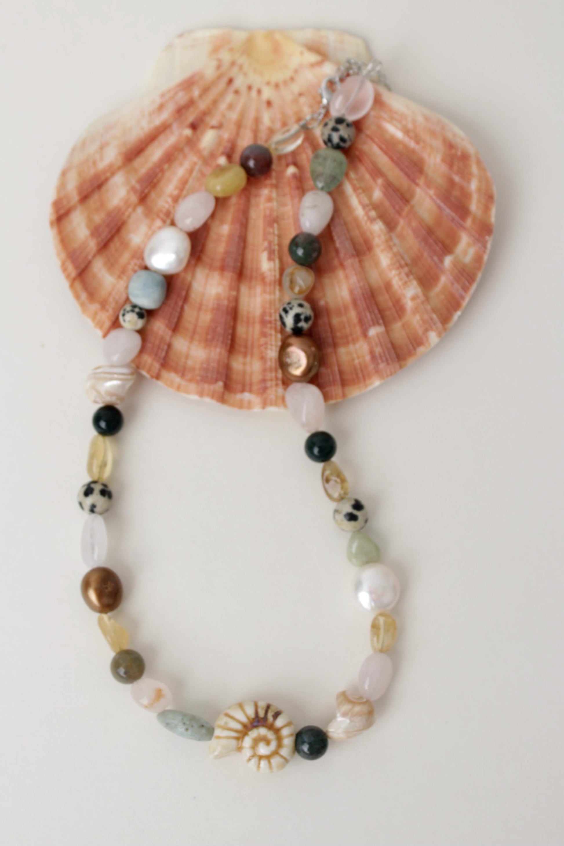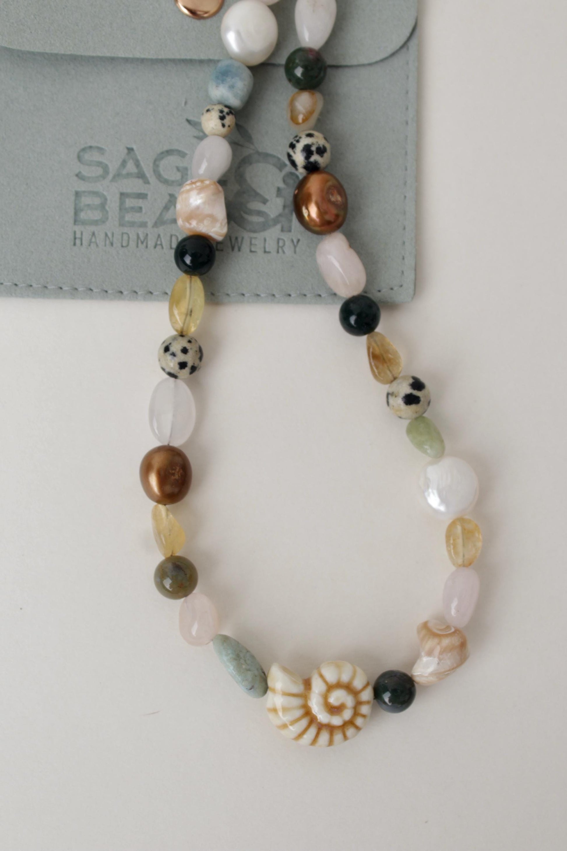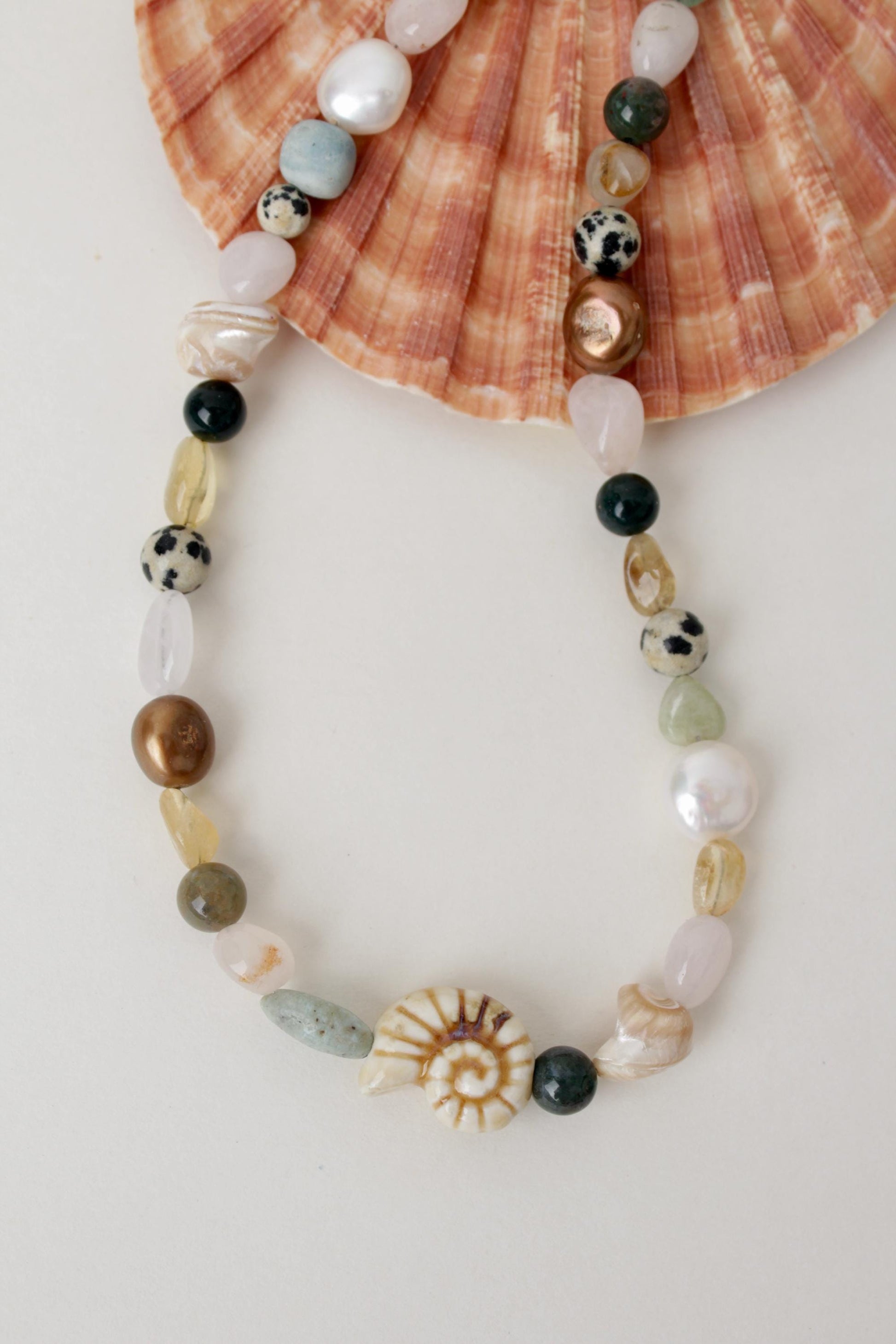 A celebration of nature’s treasures, the Ocean Whispers necklace is a harmonious blend of elegance and earthy charm. Handcrafted in our London studio, it features a soothing mix of jade, luminous freshwater pearls, tranquil larimar, radiant citrine, and clear quartz. Each stone is carefully chosen for its unique beauty and natural energy, ensuring that every necklace is truly one of a kind.