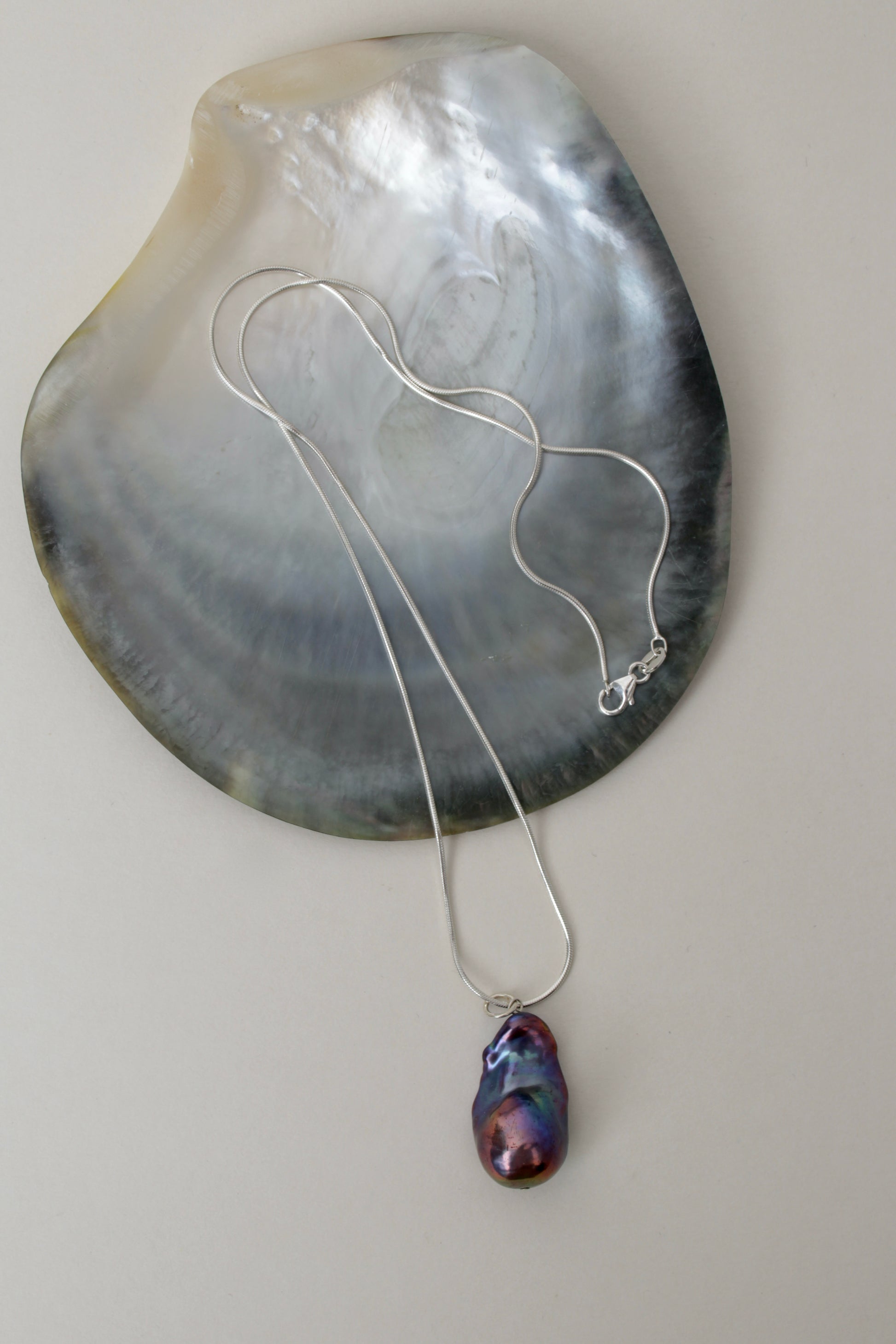 Make a timeless statement with this striking black baroque pearl pendant necklace, glowing with natural peacock hues of green, purple, and blue. Each pearl is carefully selected for its luster and captivating shape, creating a piece that feels as unique and individual as the person wearing it.