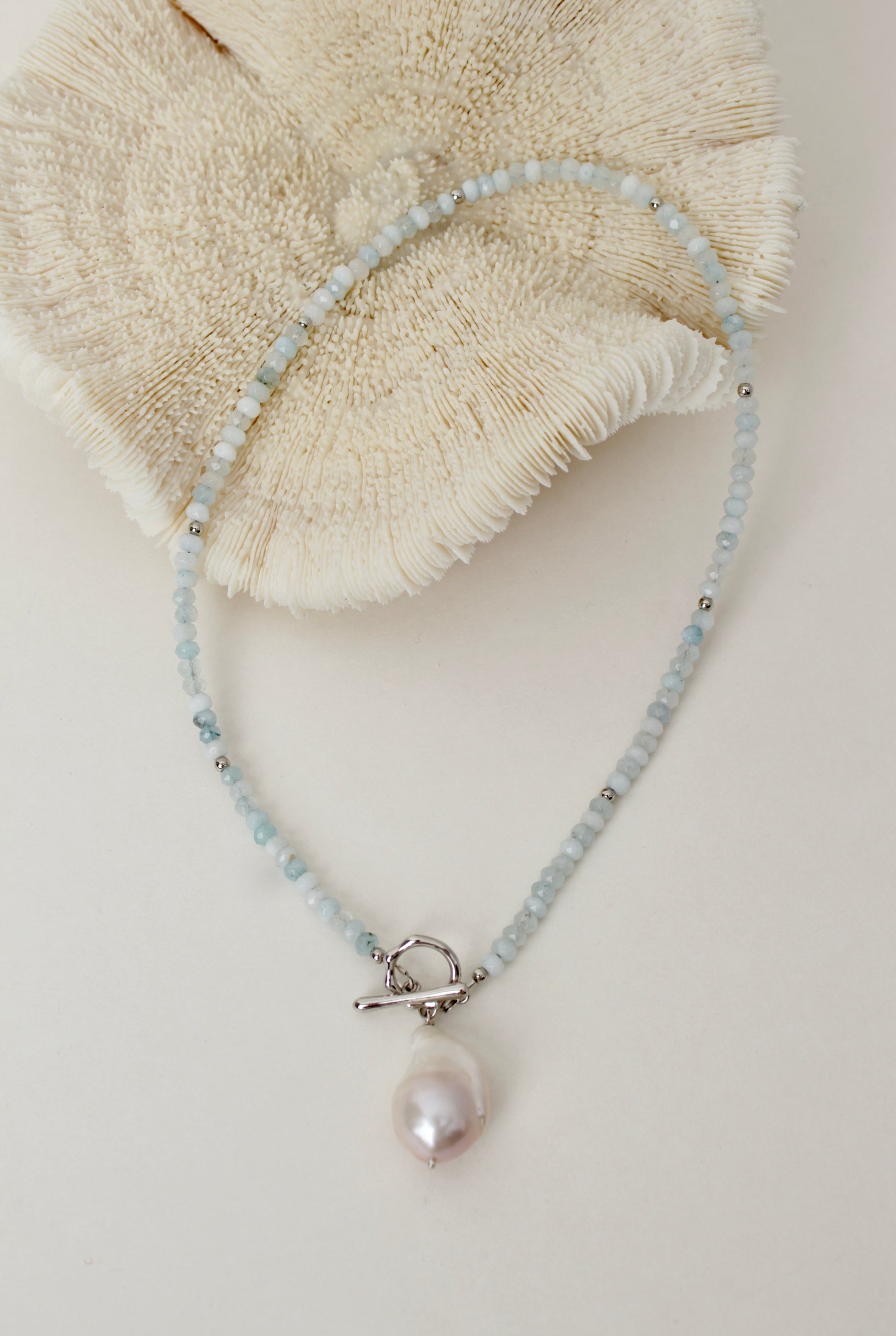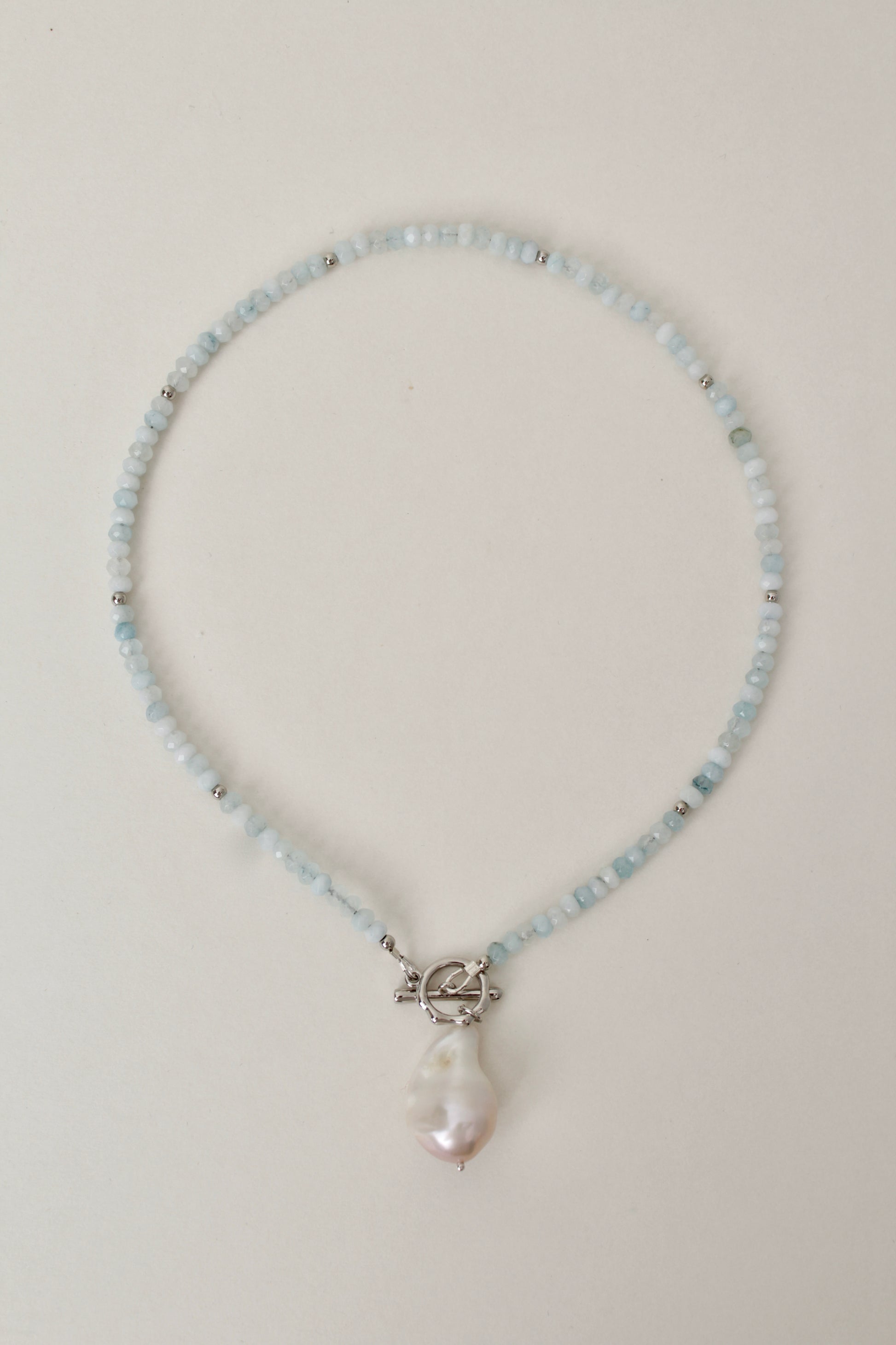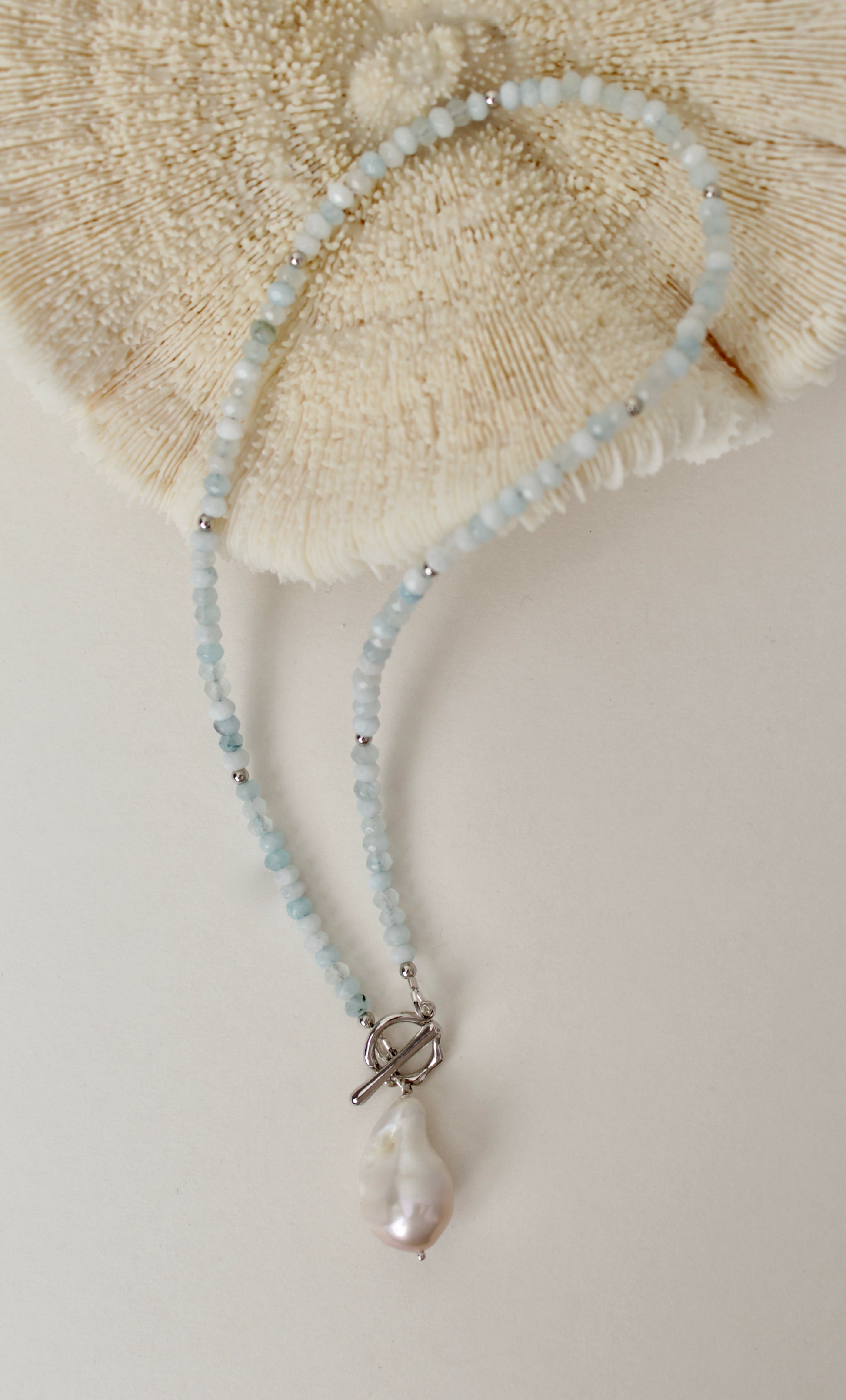 Delicate and timeless, this handmade necklace pairs soft, sky-blue aquamarine beads with a luminous baroque freshwater pearl. Each aquamarine bead is hand-strung to create a calming, ocean-inspired palette, while the bold baroque pearl pendant adds an elegant focal point that’s truly one of a kind.