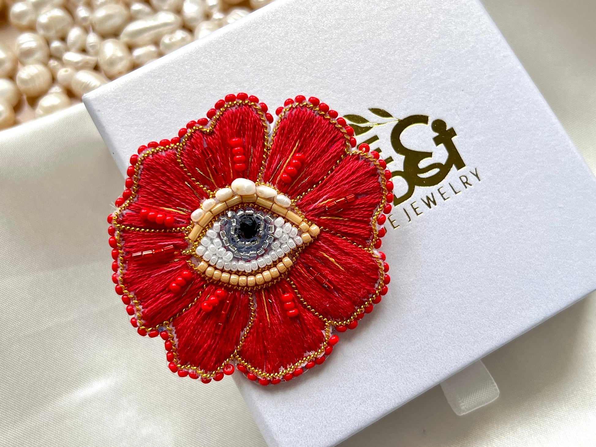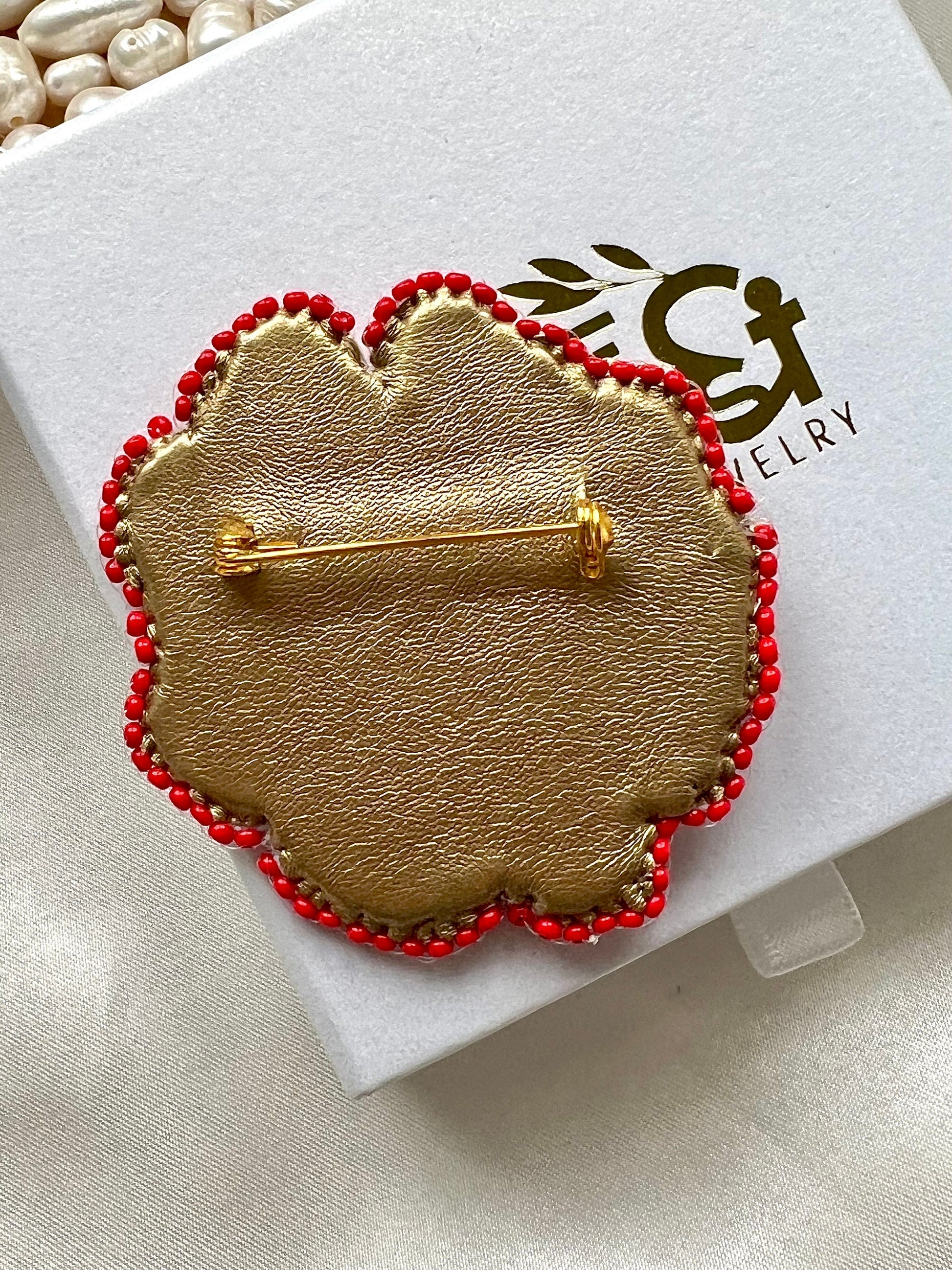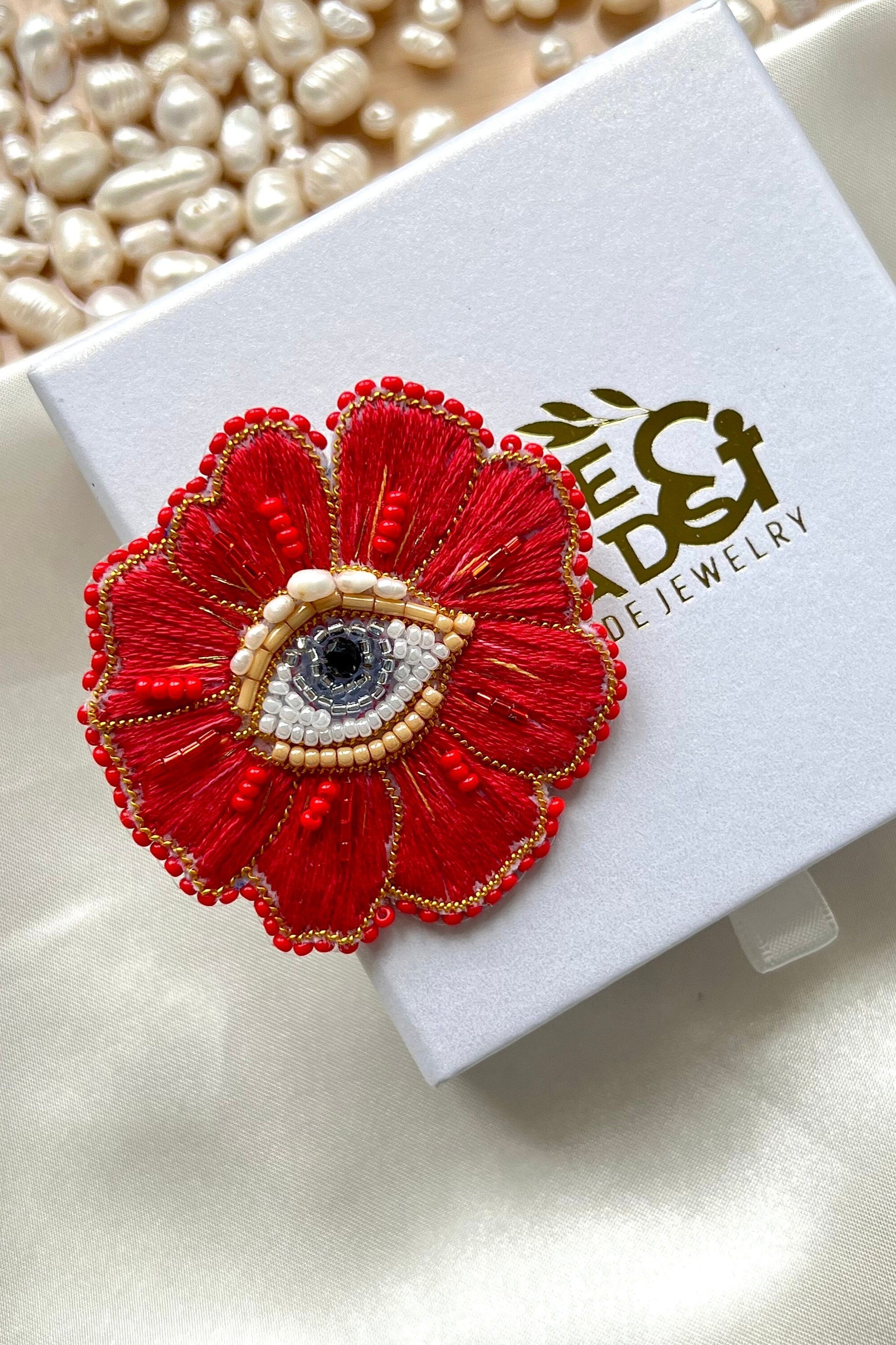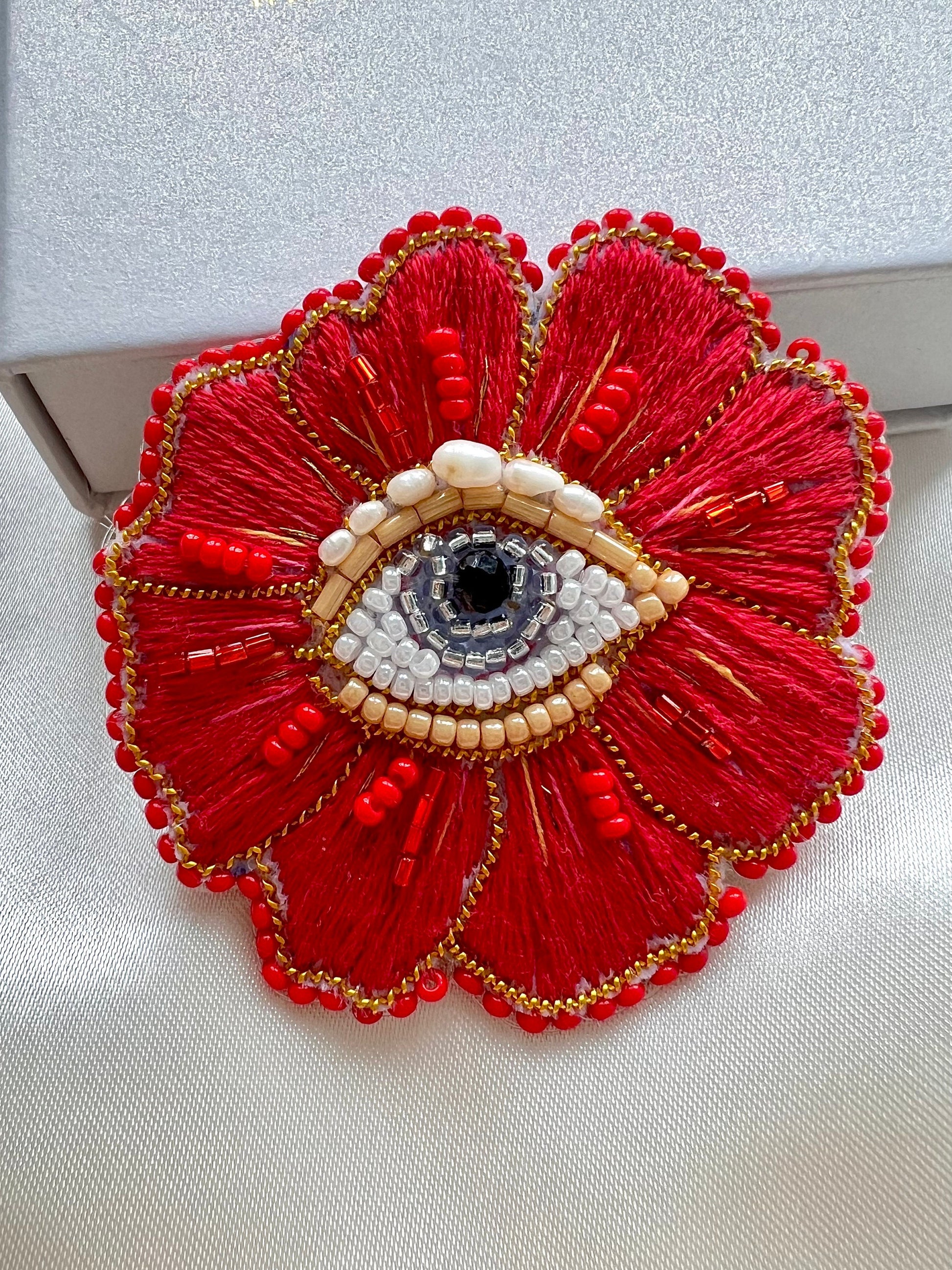 This handmade red flower with eye brooch is inspired by Mediterranean culture and crafted to highlight individuality. Featuring intricate embroidery with rich textures and colours, it’s a unique accessory that makes a bold statement. Perfect as a meaningful gift for yourself, a loved one, or a friend, each brooch is handmade with care and takes around three hours to complete.